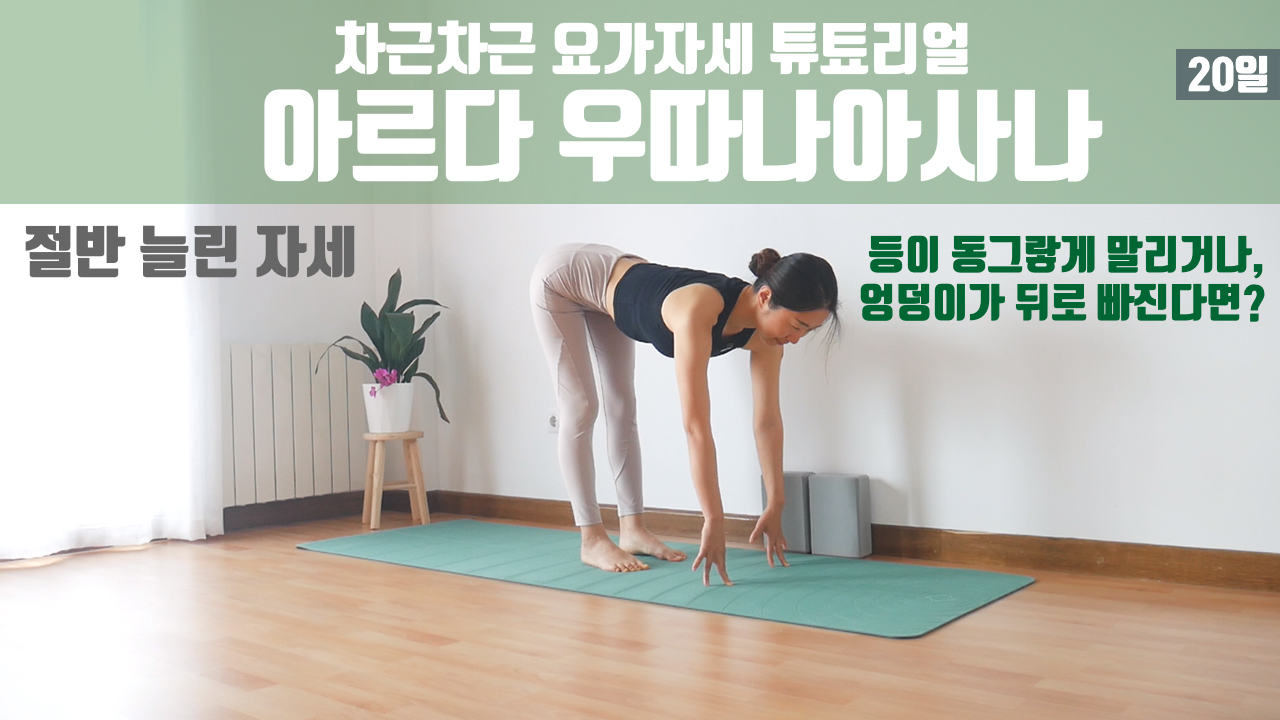 두 발을 매트에 대고 일어선 자세에서 상체를 반틈 숙입니다.