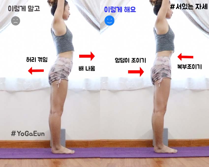 귀, 어깨, 골반, 발 뒤꿈치가 일직선이 되도록 섭니다.