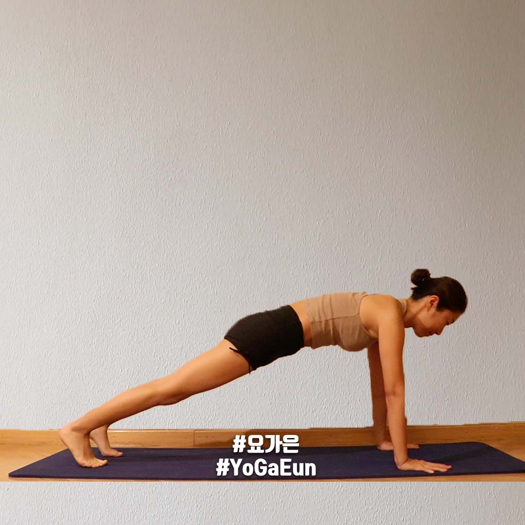 손바닥으로 바닥을 꾹 밀어내며 복부와 등을 최대한 윗쪽으로 끌어올려, 몸통이 무겁게 가라앉지 않도록합니다.