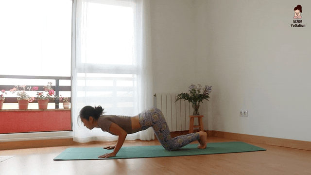 상체로 바닥을 밀어내며, 두 다리를 높게 들어려 모으고, 코어, 허벅지 안쪽까지 힘을 단단하게 채웁니다.