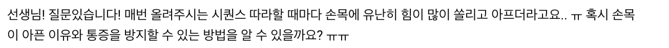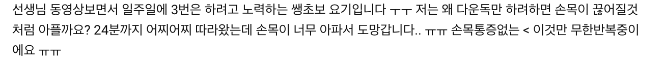질문 : 요가를 하고싶은데, 어깨나 손목이 약해요. 무리없는 동작으로 운동 되는거 추천 부탁드려요!! 쌤~~손목이 아플때 어떻게 해야하나여?? 손바닥에 양말이라도 받치니깐 좀 괜찮았던거 같아요 이렇게 해도 되..