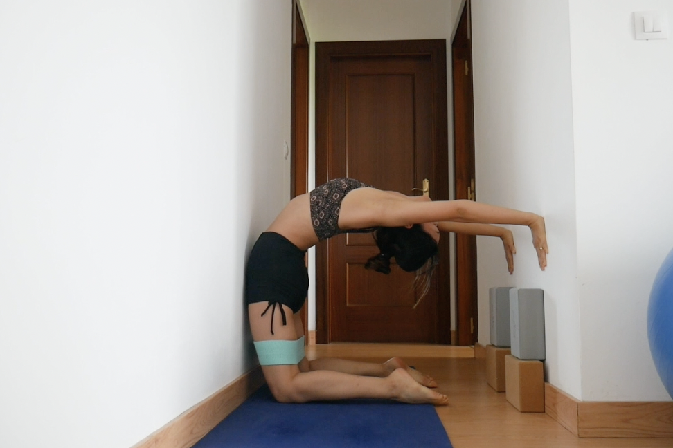 집이 비좁더라도 이렇게 수련할 수 있어요! 밴드를 활용해서 허벅지가 벌어지지 않도록 잘 잡아주면 하체가 안정된 상태에서 후굴을 이어갈 수 있어요. 등의 힘을 느껴보세요!