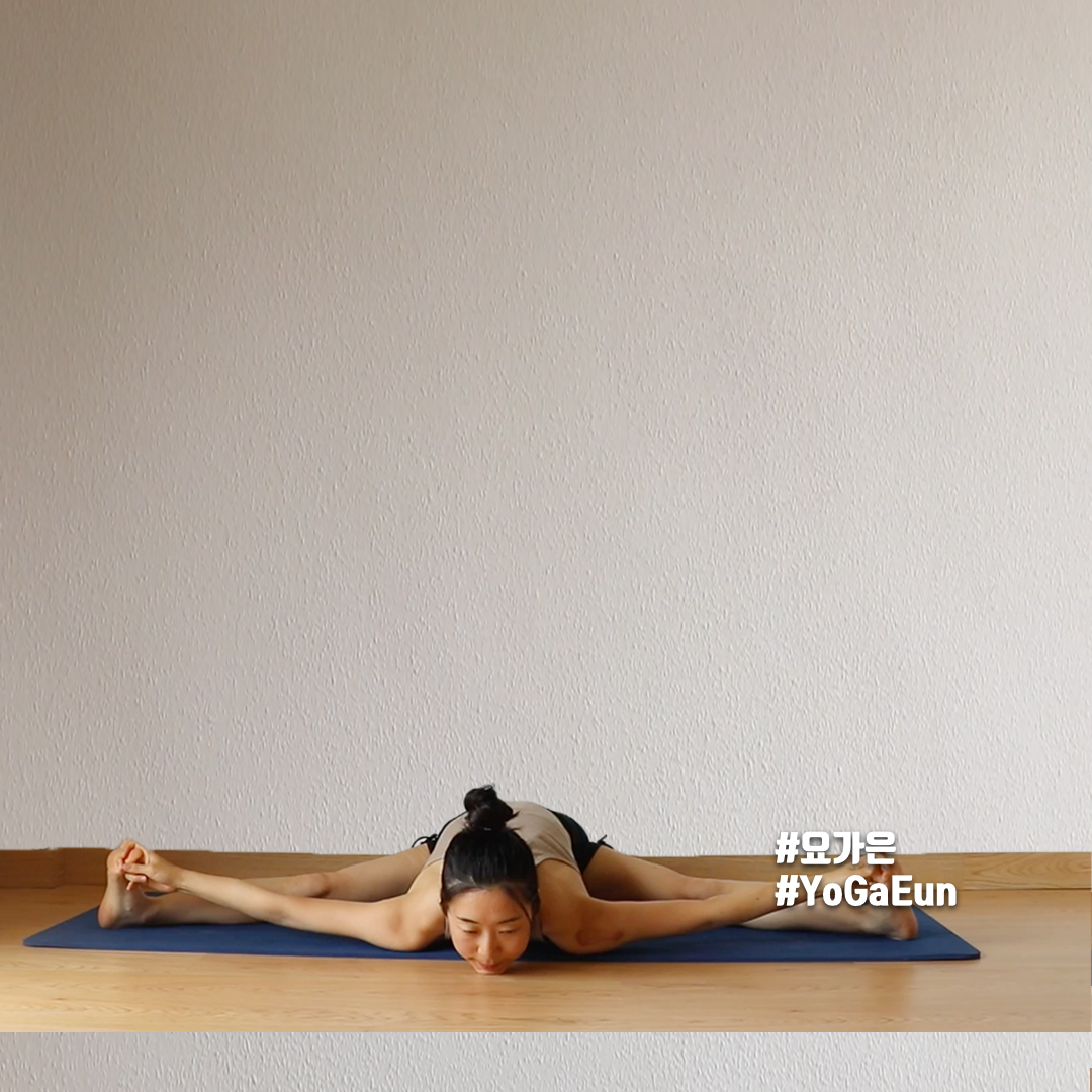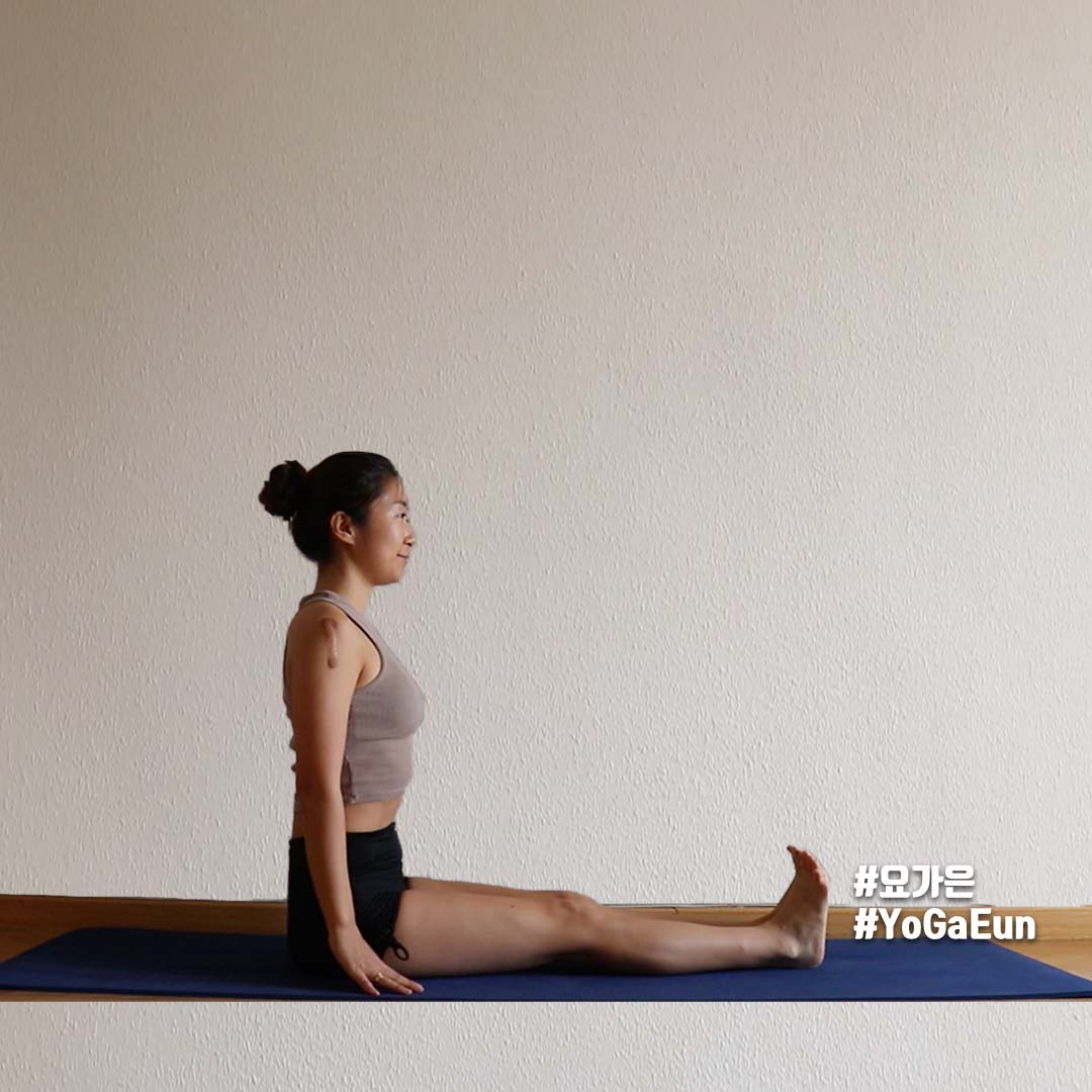 엉덩이를 바닥에 대고 매트에 앉은 자세입니다. 고관절을 비롯한 하체를 유연하고 튼튼하게 하는 효과가 있어요.🙌